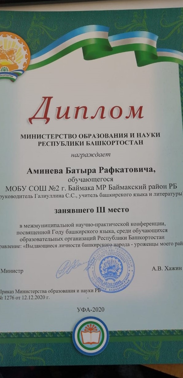 Башҡорт теле йылы сиктәрендә район, республика күләмендә бик күп саралар үтте. 9 б класс уҡыусыһы Әминев Батыр регион - ара фәнни - практик конференцияла ҡатнашып, " Минең районымдан сыҡҡан башҡорт халҡының күренекле шәхестәре" йүнәлешендә 3 -сө урынға лайыҡ булды. Уны был еңеүе менән ихлас күңелдән ҡотлайбыҙ.