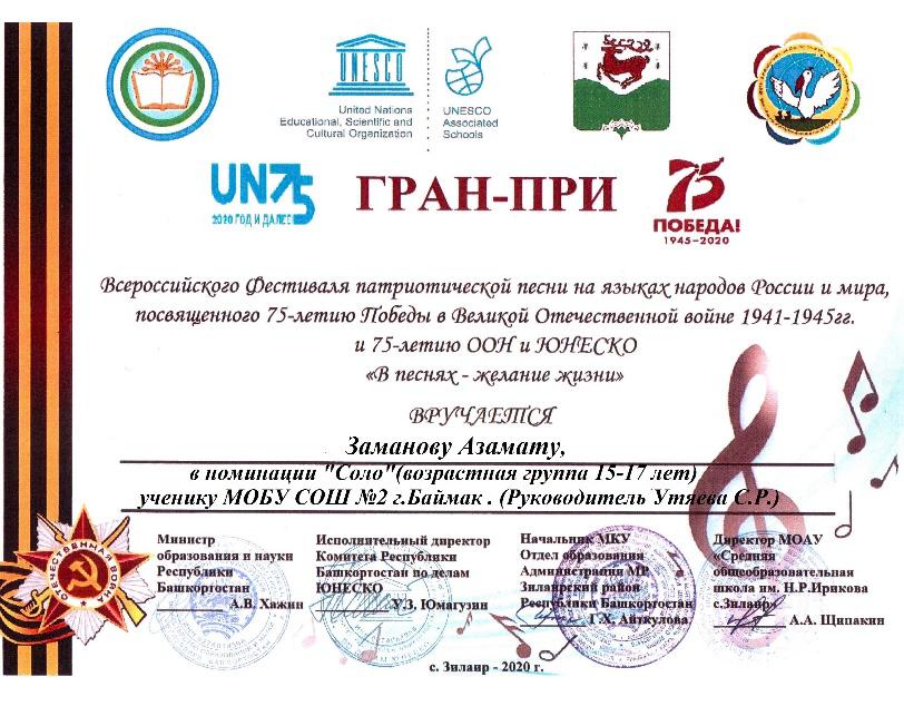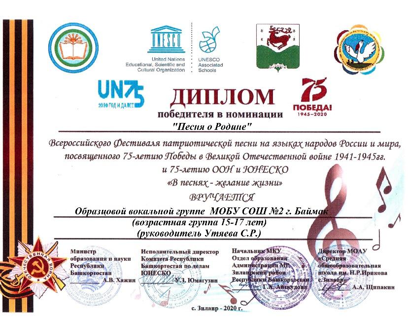 " Всероссийский Фестиваль патриотической песни на языках народов России и мира, посвященного 75-летию Победы в Великой Отечественной войне 1941-1945 гг. и 75-летию ООН и ЮНЕСКО "В песнях-желание жизни""