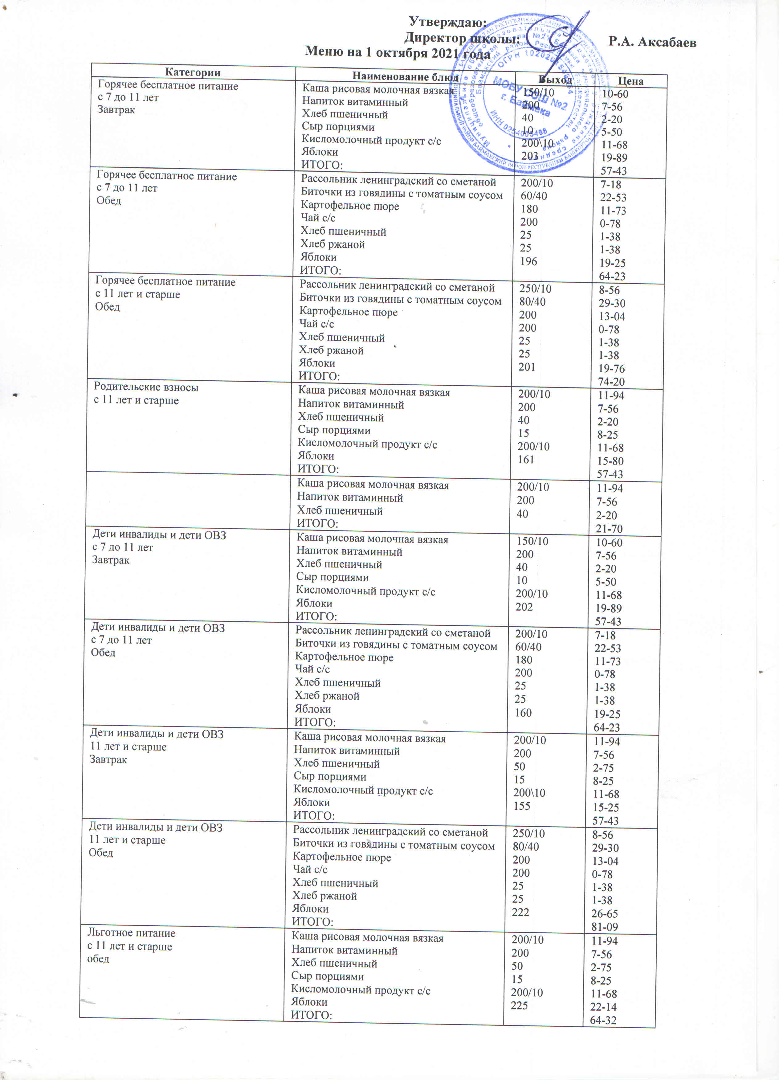 (Меню на 01.10.2021 г. )