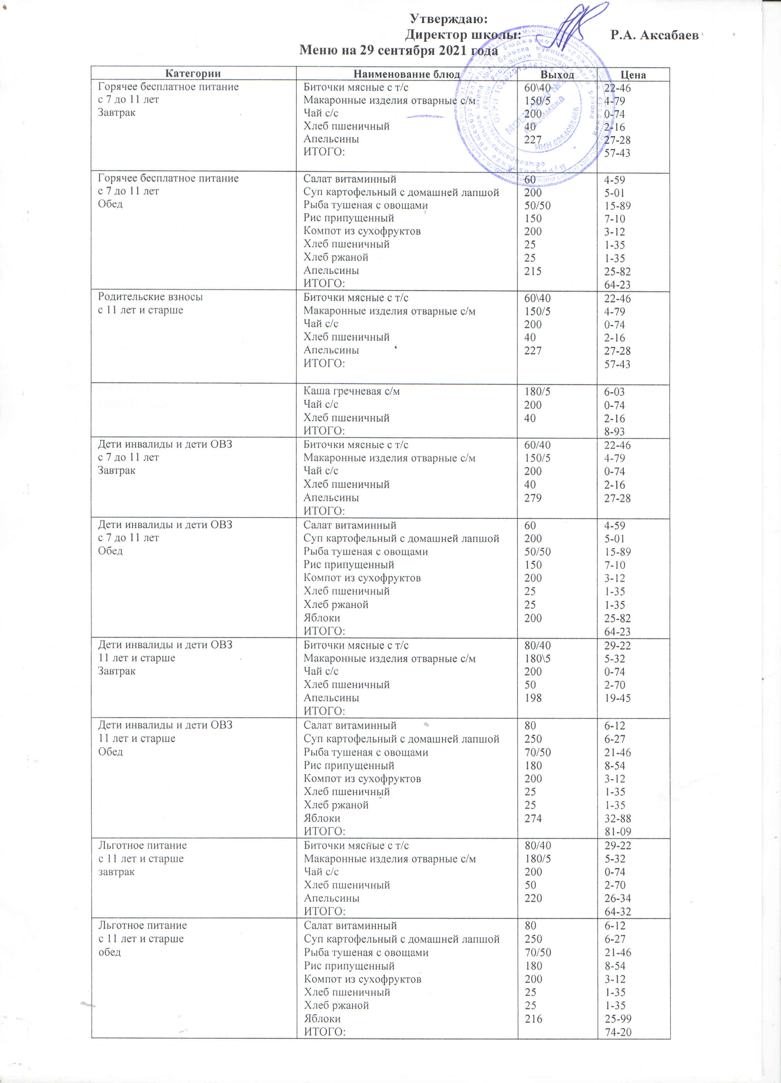 (Меню на 29.09.2021 г. )