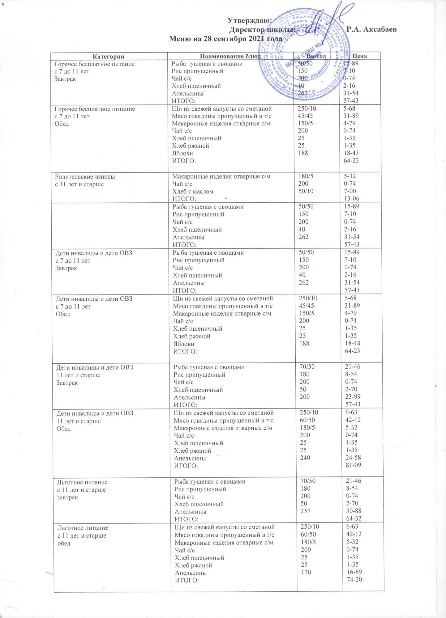 (Меню на 28.09.2021 г. )