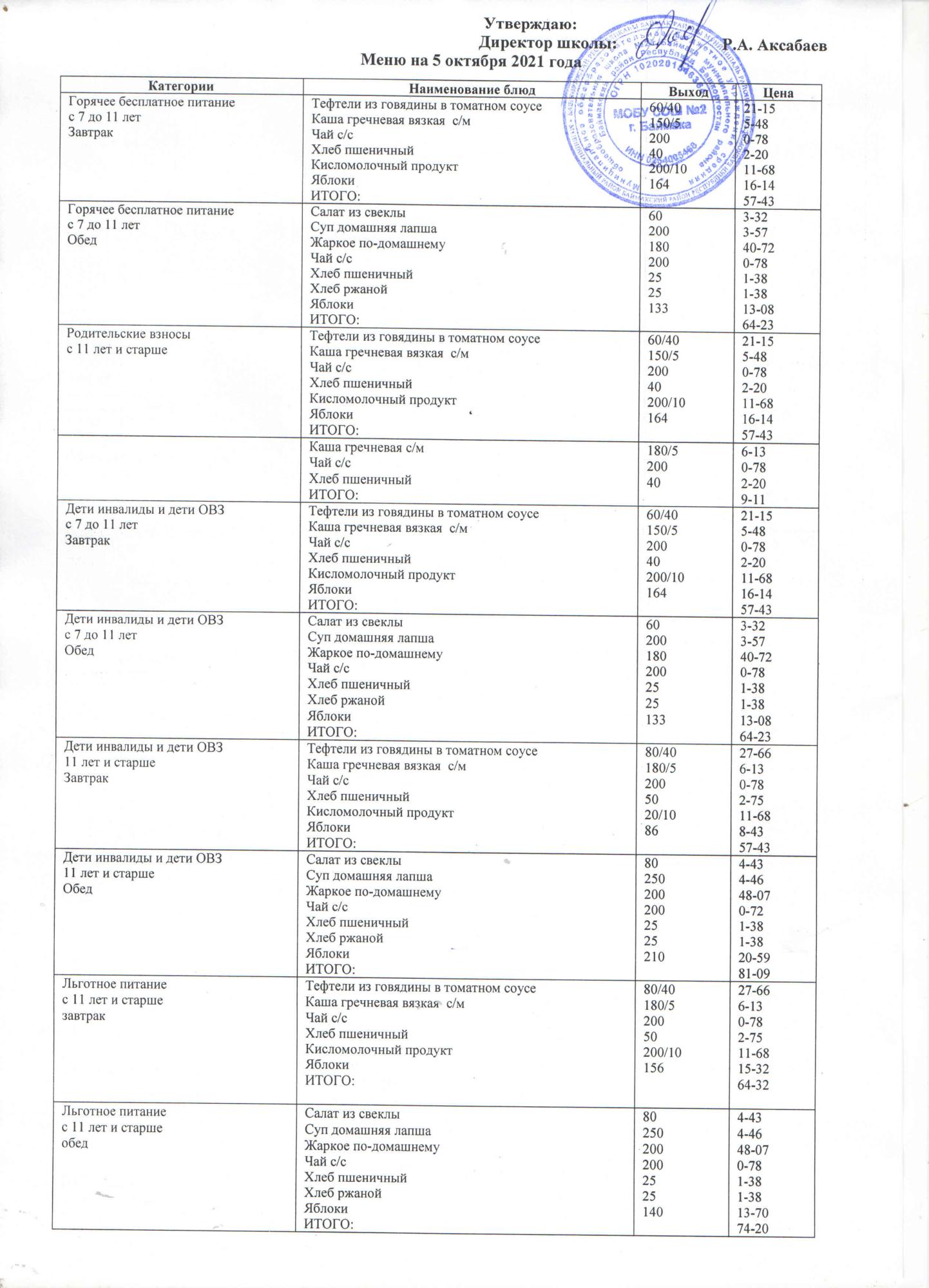 (Меню на 05.10.2021 г. )