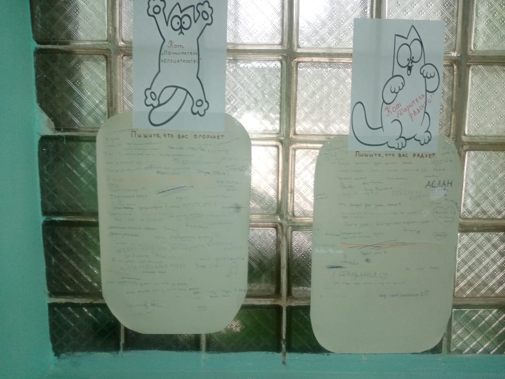 Психологическая акция "Два кота" привлекла внимание детей своей необычностью. Учащимся было предложено выразить свои положительные эмоции для кота "Даритель радости" и отрицательные для кота "Пожиратель неприятностей". Ребята остались довольны возможностью написать о своей радости или же поделиться тем, что их огорчает.