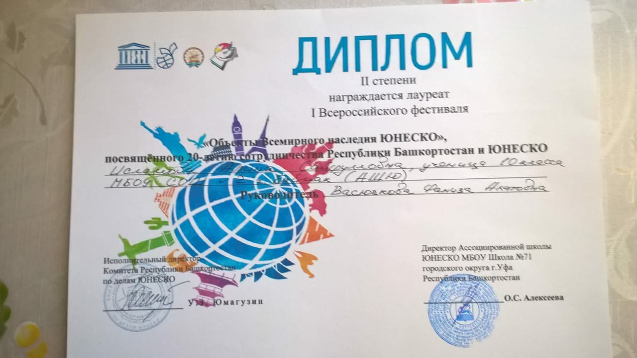 В итоге, Исламова Алина награждена Дипломом II степени среди участников Ассоциированных школ ЮНЕСКО.