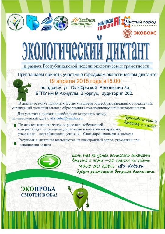 В целях популяризации экологического мировоззрения, поддержки и развития системы непрерывного экологического образования и воспитания в регионе, Министерство природопользования и экологии Башкортостана совместно с республиканским детским эколого-биологическим центром объявляет о проведении акции «Неделя экологической грамотности».