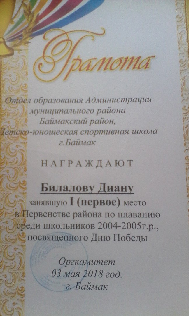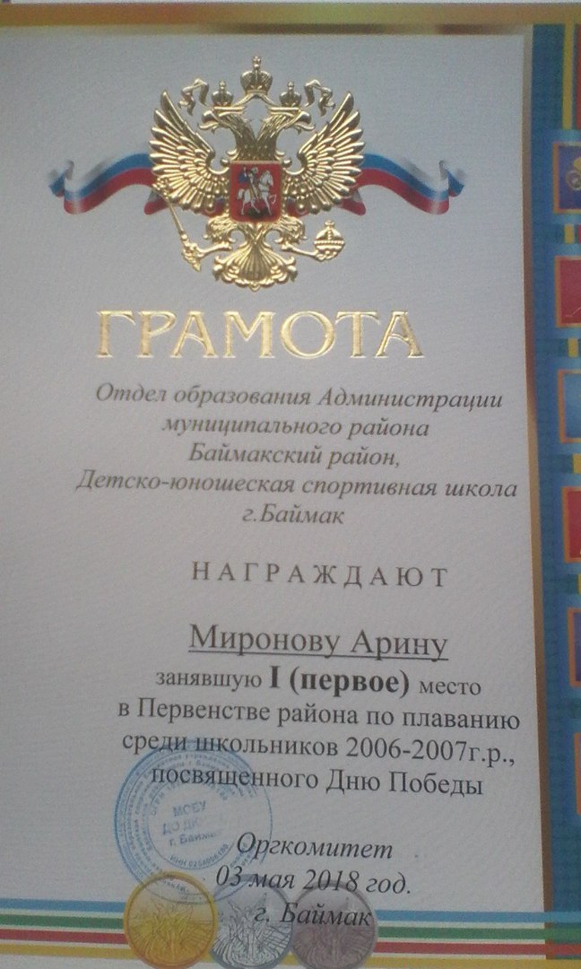 Поздравляем победителей Первенства района по плаванию среди школьников 2004-2005, 2006-2007 г.р, посвященного Дню Победы, учащихся МОБУ СОШ №2 г. Баймака Миронову Арину, 5а класс, Билалову Диану, 7а класса.