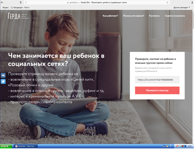 Есть сайт который поможет проверить, состоит ли ребёнок в опасных группах в социальных сетях, для этого надо перейти по ссылке: gerdabot.ru и ввести id странички ребенка, после чего сервис предоставит Вам ответ.